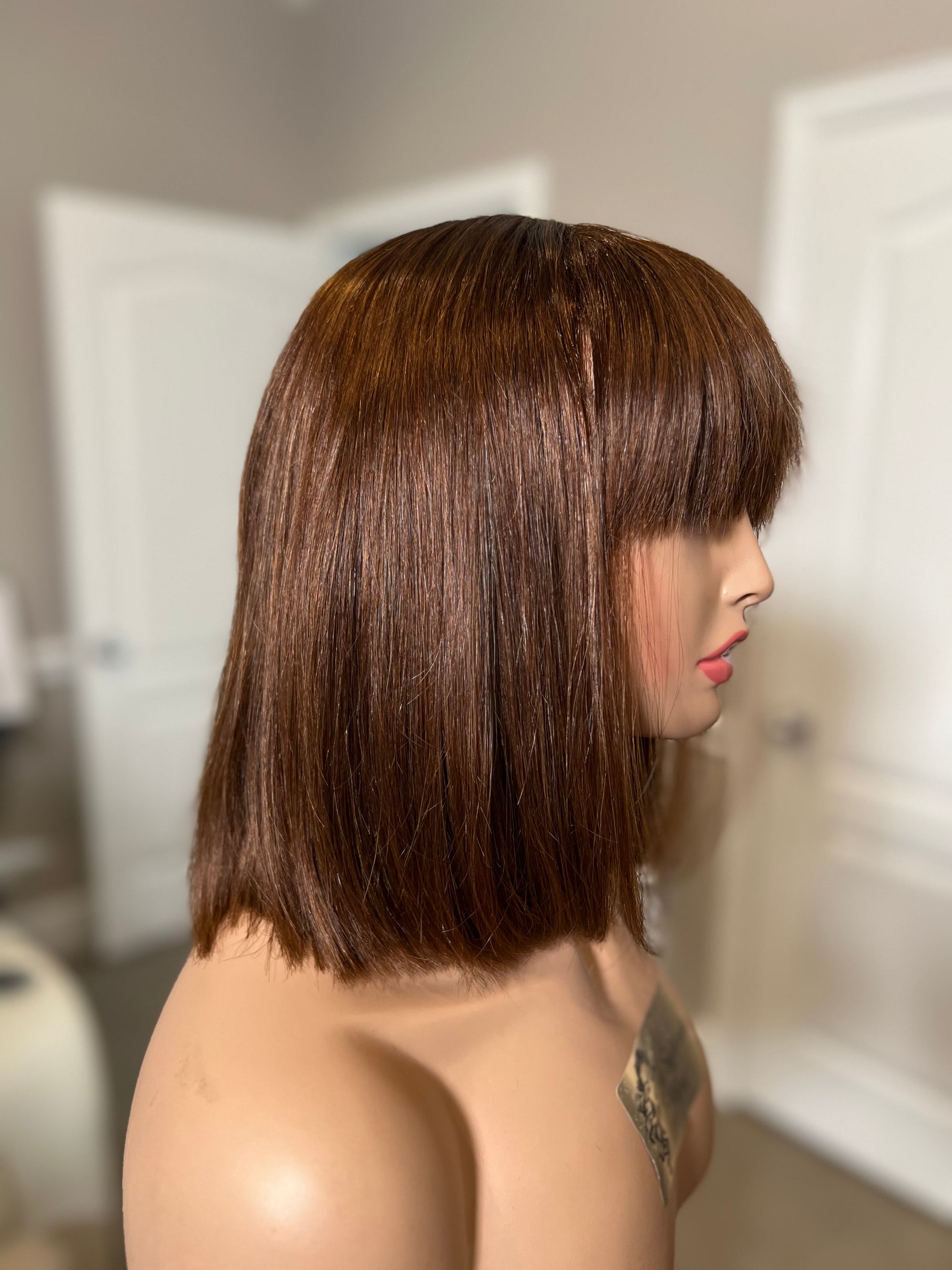 12” bang bob wig in a beautiful chocolate brown color! Top quality virgin hair with bangs and a “faux scalp” part on the cap! Effortless style and easy glueless wear!