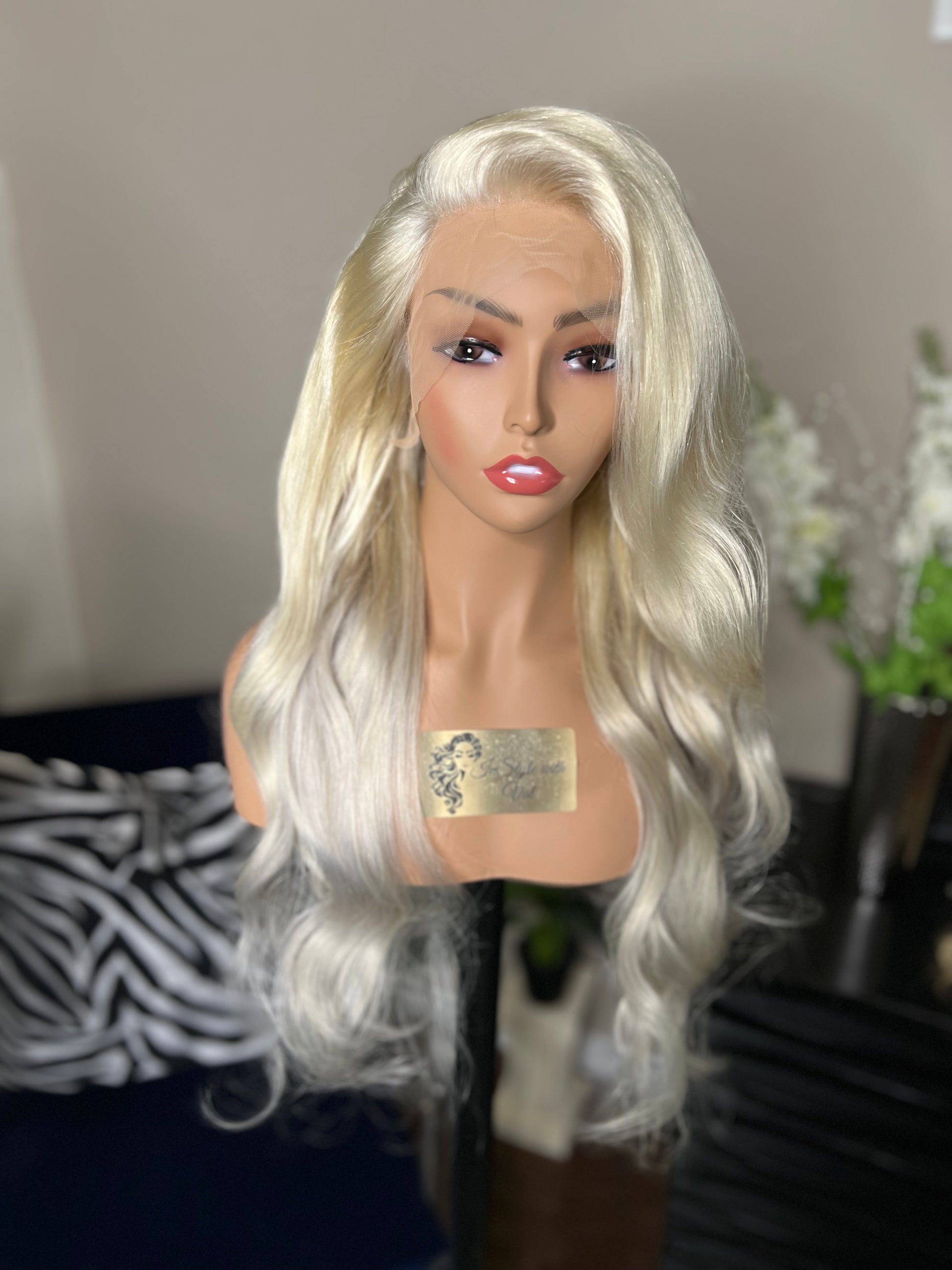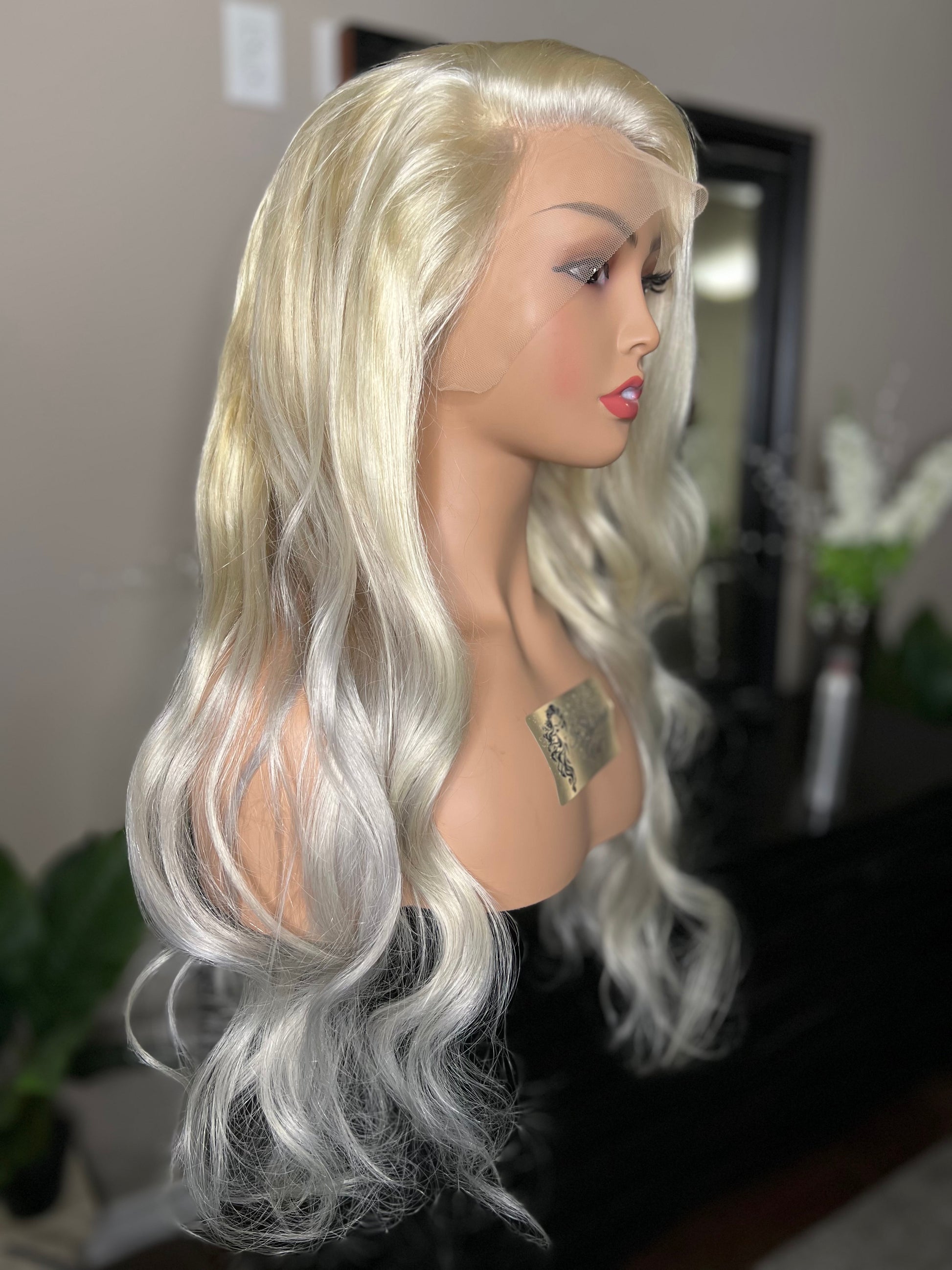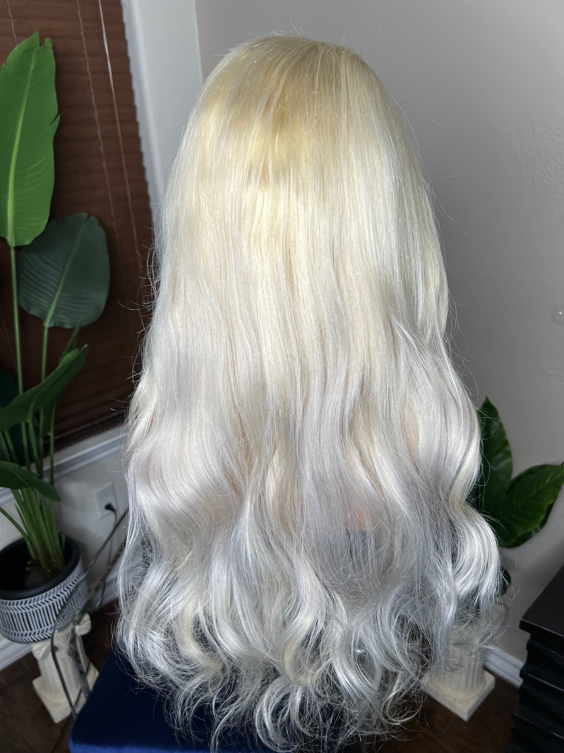 24β of high quality blonde virgin hair toned to perfection! She has warm tones throughout with a touch of icy, ash tones on the ends! Very subtle and beautifully blended! This tonal blonde looks good on any skin tone! 13x4 transparent lace frontal completes this wig very nicely for a finished easy to wear look. 180% densityΒ