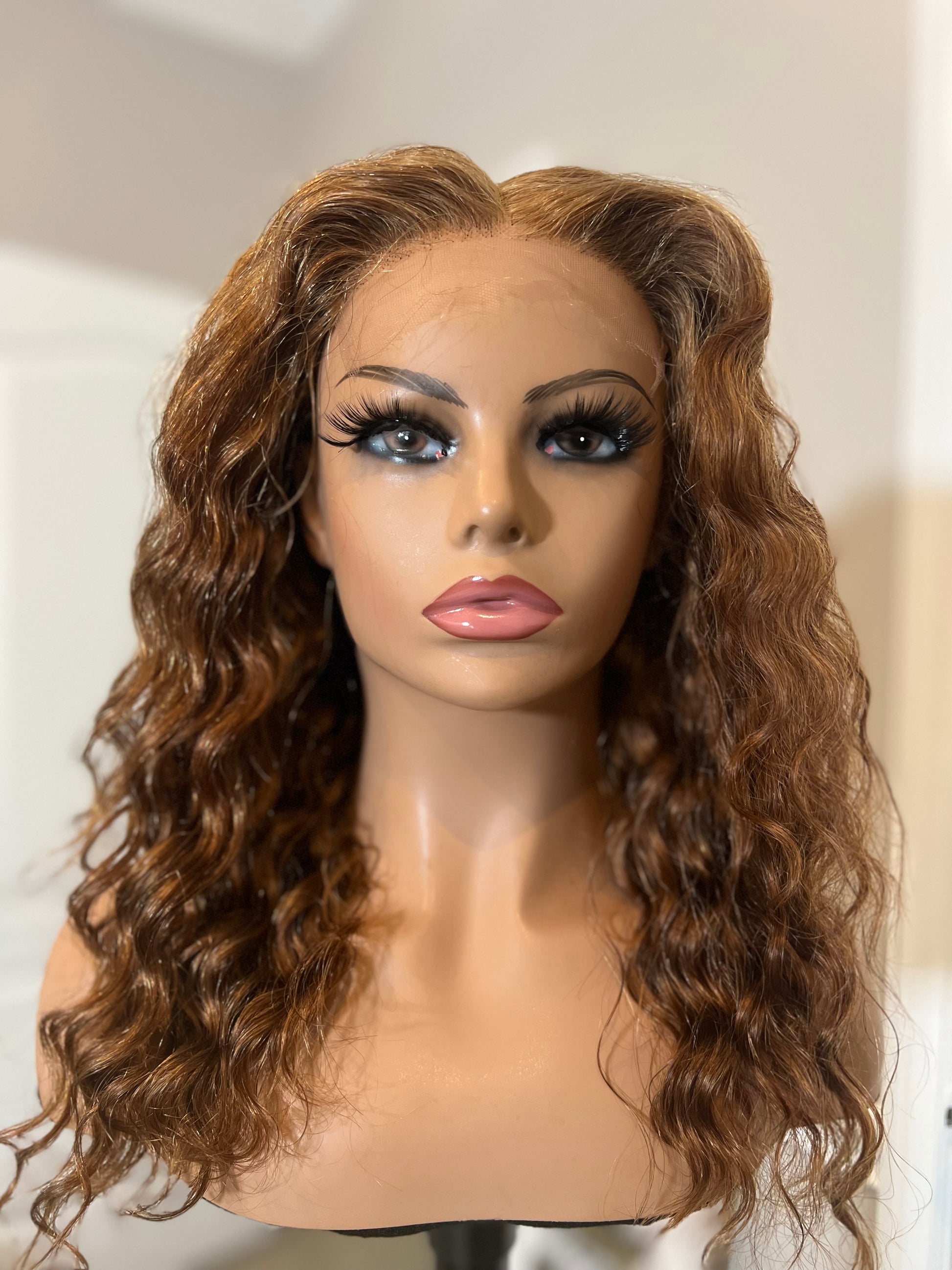 18” Caramel color deep wave/ curly virgin hair wig. 5x5” HD lace closure with ventilated wig cap to allow access to your scalp and air! Fully glueless design with silicone added to elastic band and around the edges of the cap for extra security. She’s not slipping on you at all!